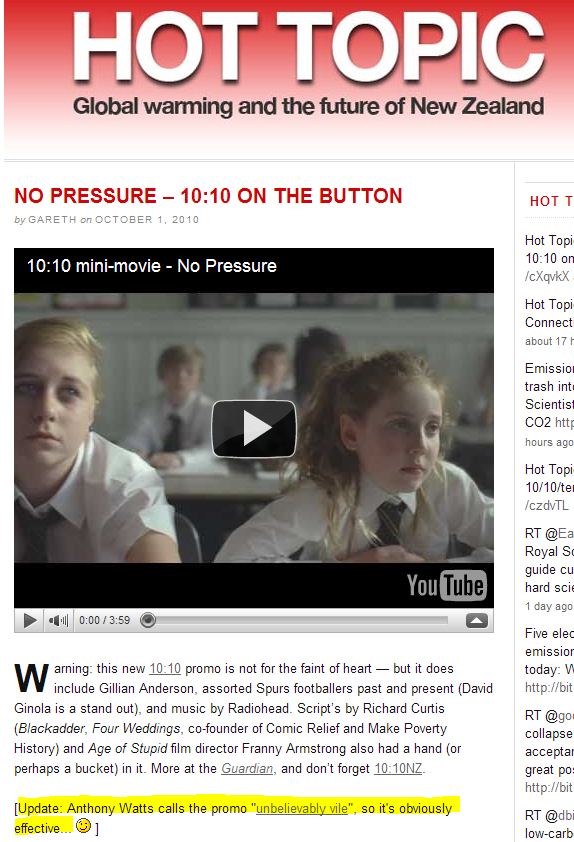 And how do we know that it’s about as disastrous an ad campaign since, er … Alan Grayson’s “Taliban Dan” spot? Unlike the clueless and despicable Grayson, the people behind “10:10 - No Pressure” keep trying to get this spot removed from YouTube. As a precaution, I’ve included Stephen Gutkowski’s Eyeblast upload to be sure it sticks around, and sticks to the AGW Movement like bloody flesh after an explosion. (It’s also...