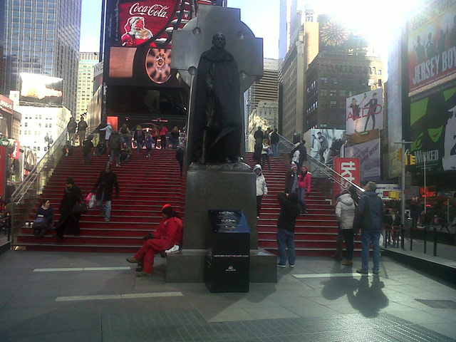 Twitter : NEXT » Instead of the red capes initially reported being put on the city's statues, it looks like NBC's The Cape is adorning the figures with the black/blue cape the show's namesake wears.